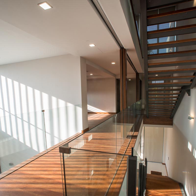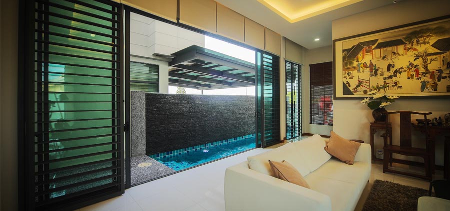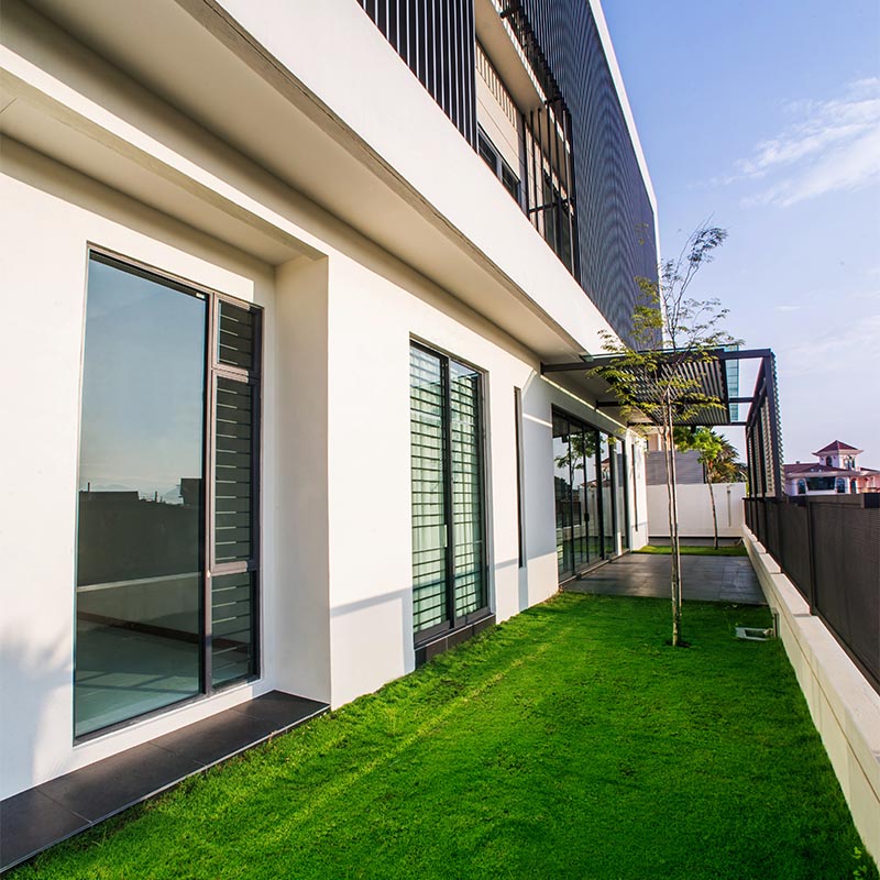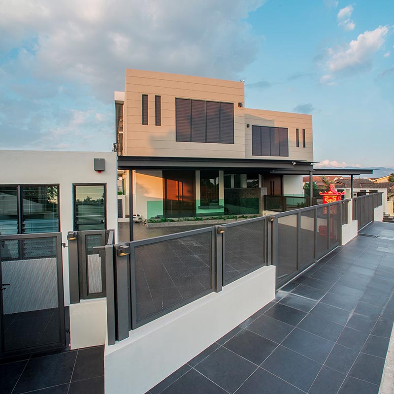 The front façade produce an atmosphere of a homely two-storey house, rather than a three-storey mansion, and minimum openings to minimize noise from road traffic. Since both homes have their side façades facing east and west, vertical aluminium sun shade screen are incorporated to provide effectively reduce sunlight and heat penetration into the building. Other than that, the screen also acts as security feature.
